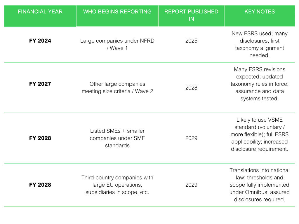 - For listed Small & Medium Enterprises (SMEs), standard reporting under ESRS is expected to begin for FY 2028 (= reports in 2029).