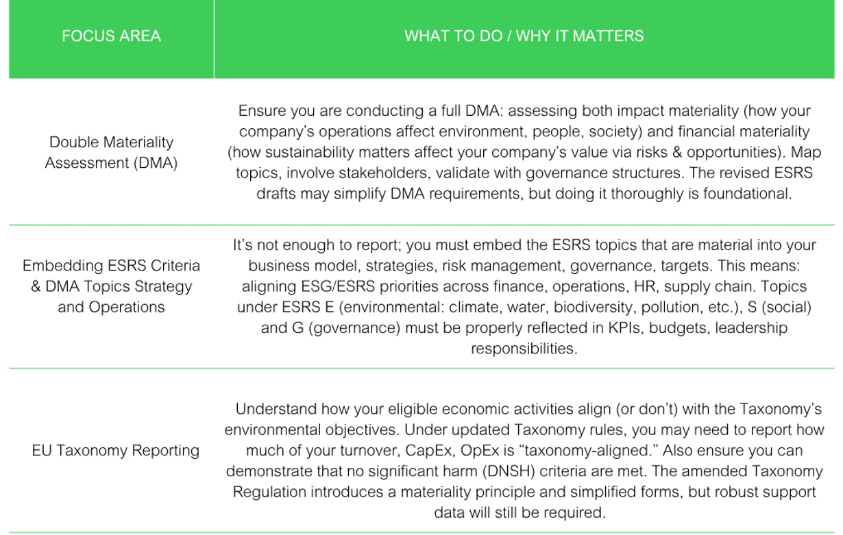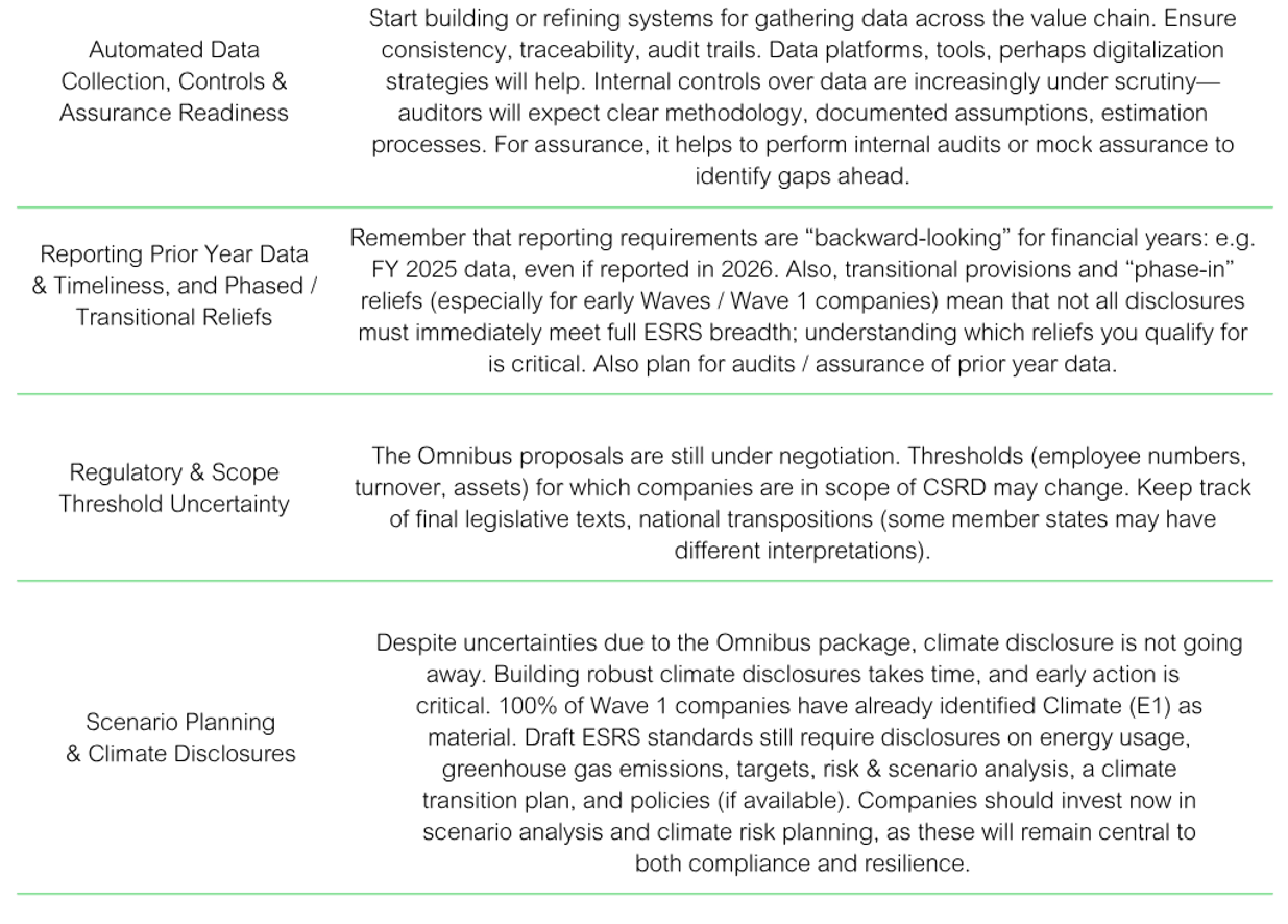 Companies preparing for CSRD / ESRS reporting in coming years (especially those with FY 2025 data to report in 2026) should invest now in: