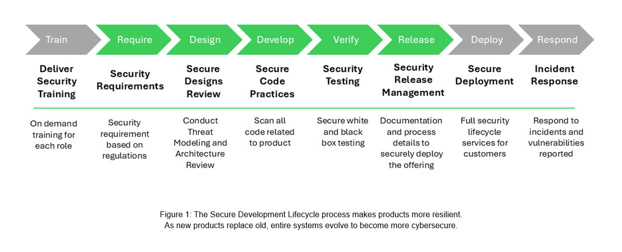 Schneider Electric’s “Cybersecurity by Design” whitepaper states, “The Secure Development Lifecycle process makes products more resilient. As new products replace old, entire systems evolve to become more cybersecure.” In the graph below, you can see the progression from training, development, to incident response.